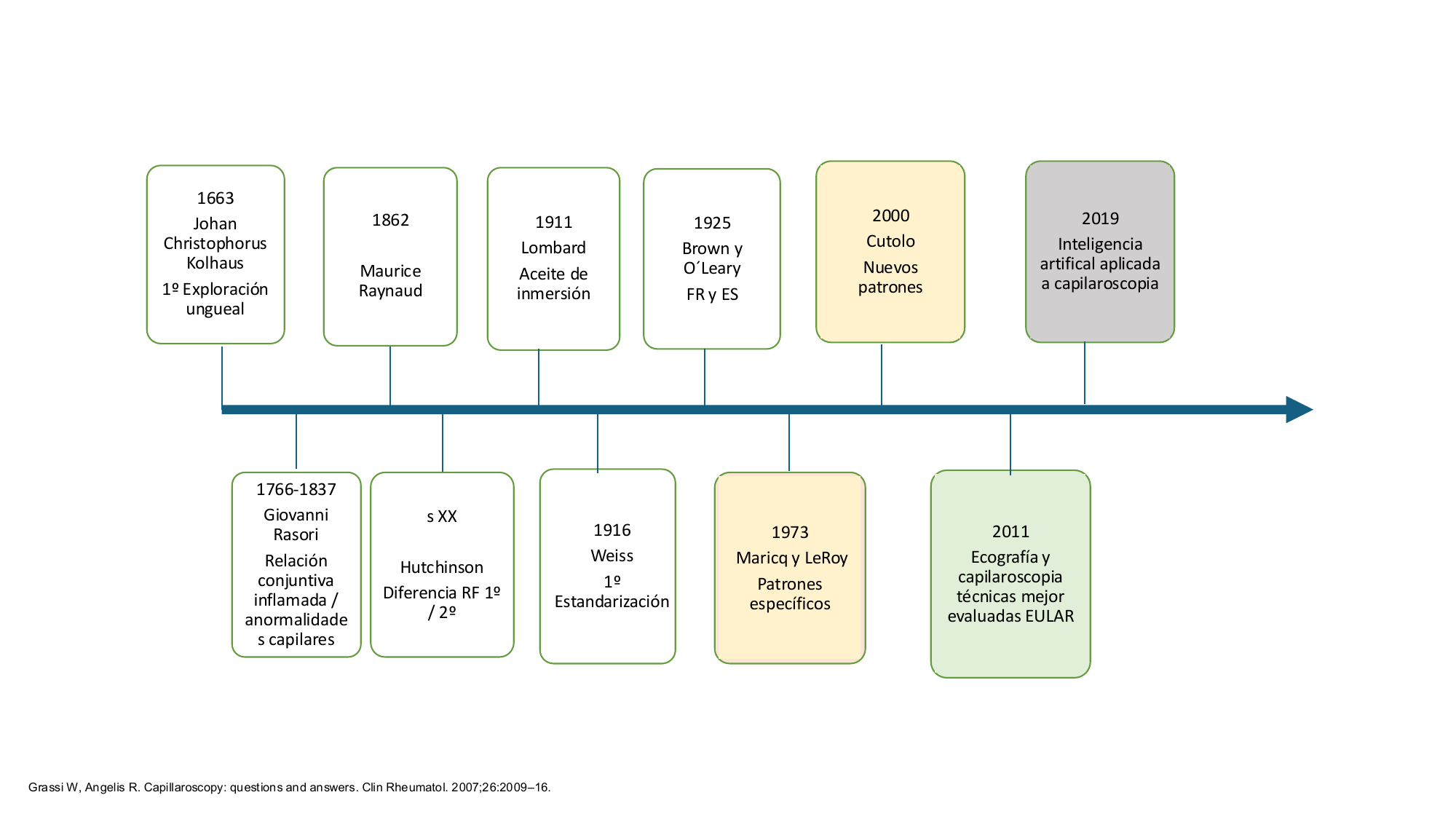 El desarrollo de la capilaroscopia siguió la evolución del microscopio. Lombard describió en 1912 la distribución del lecho capilar periungueal en humanos y Brown y O’Leary publicaron en 1925 una de las primeras descripciones del patrón esclerodérmico cutáneo [12, 13]. La videocapilaroscopia digital moderna consolidó después la cuantificación, el archivo de imágenes y la comparación longitudinal [1, 2].