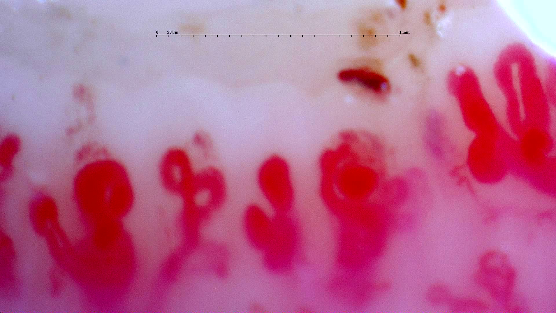 En la región periungueal distal el asa capilar discurre casi en paralelo a la superficie cutánea, lo que permite ver el capilar completo en longitud y no solo como un punto. Esa disposición anatómica convierte a la región periungueal en la ventana más útil para estudiar densidad, diámetro y arquitectura del asa capilar [1, 2].